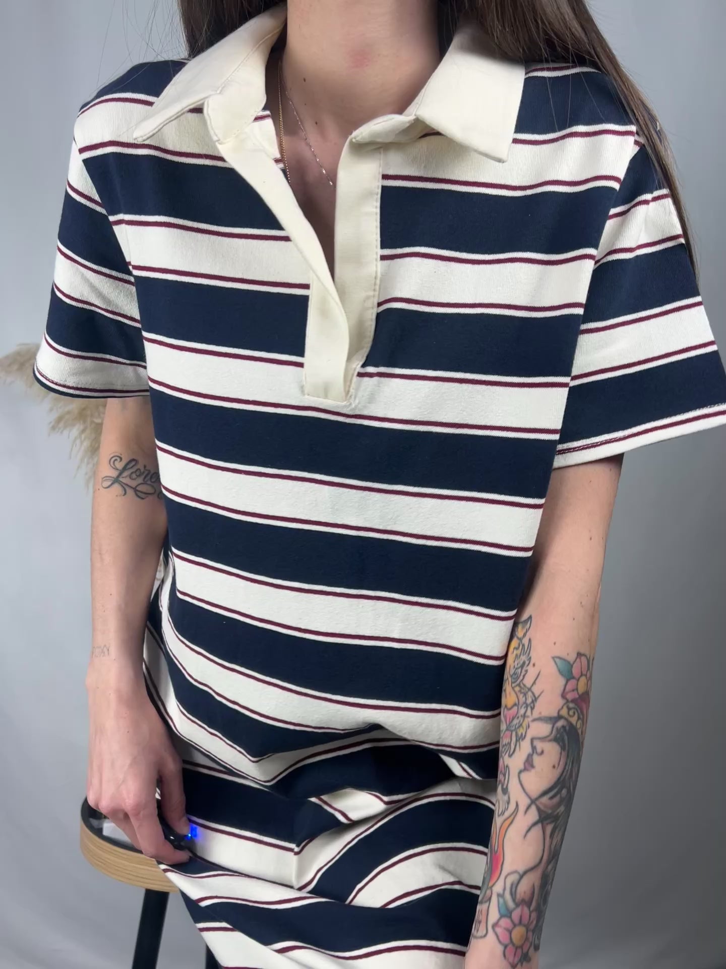 Dona un tocco sportivo ed elegante al tuo guardaroba con questo vestito a righe stile polo da donna. Caratterizzato da un design moderno con colletto polo e righe dinamiche, è il capo perfetto per un look casual ma curato.